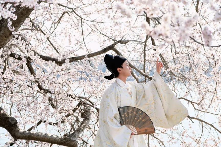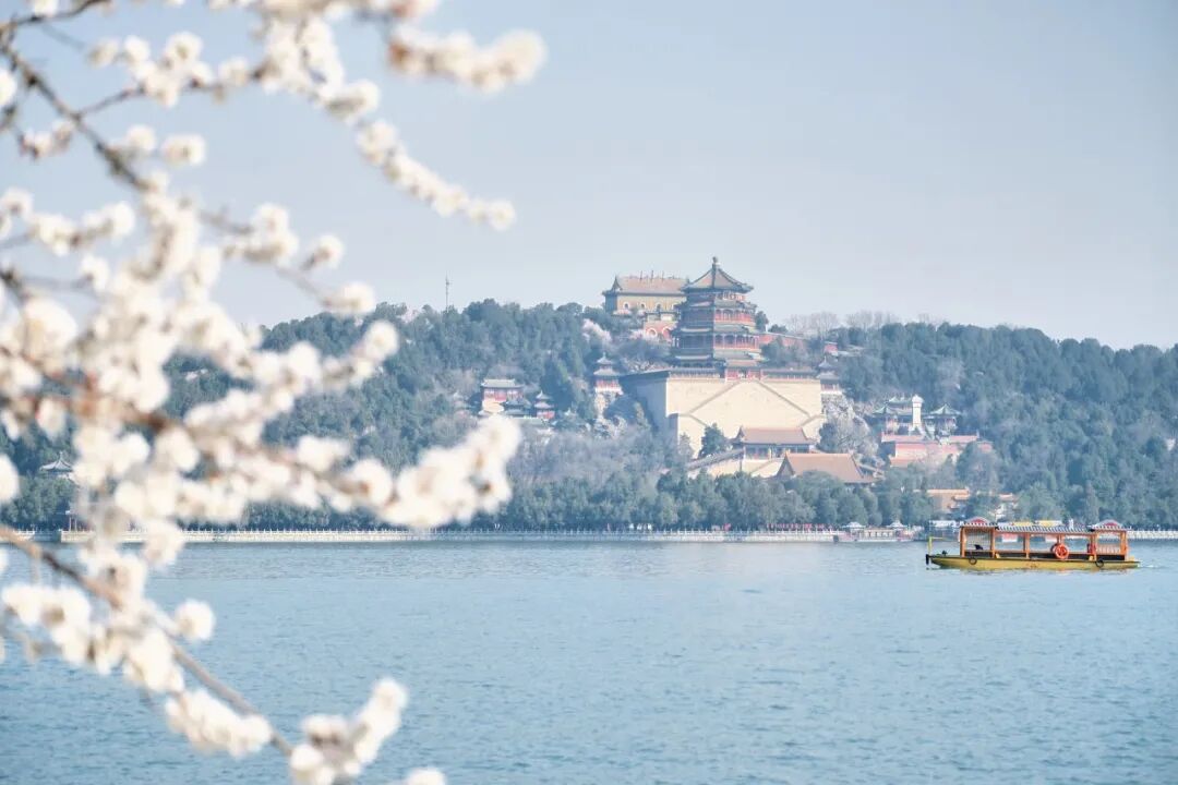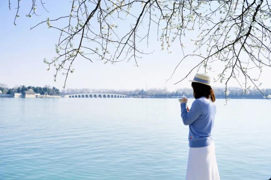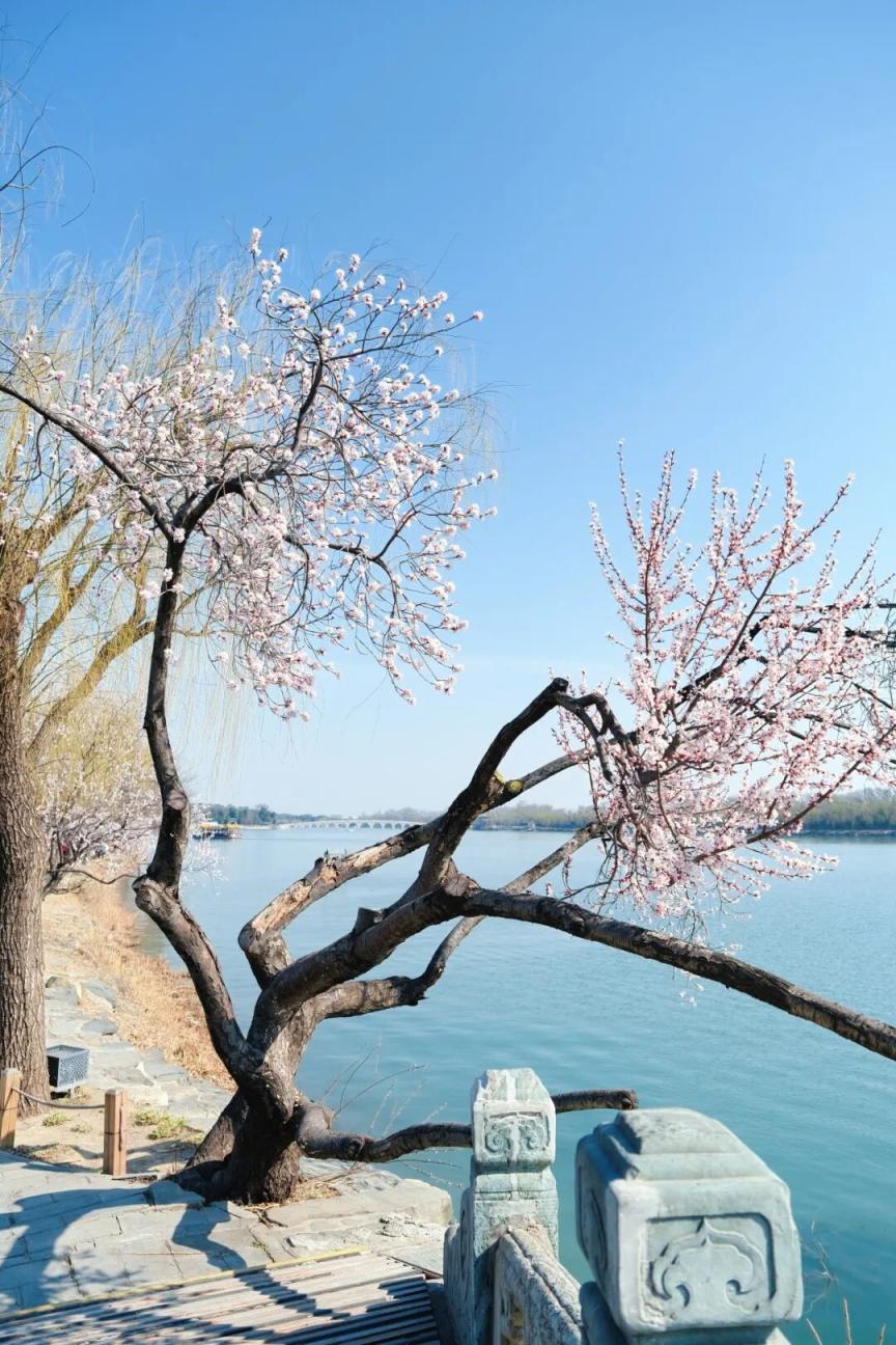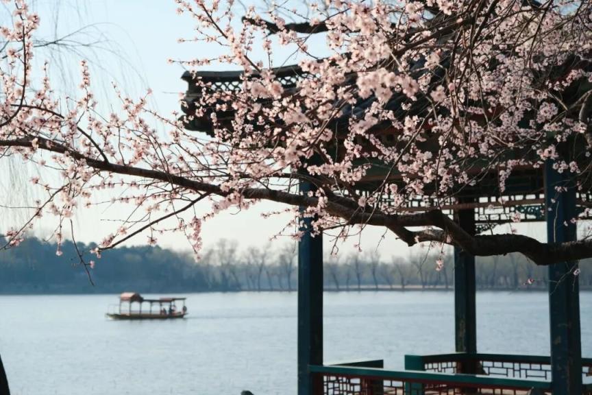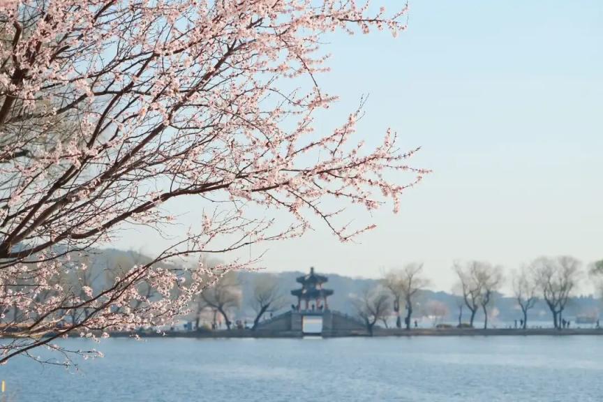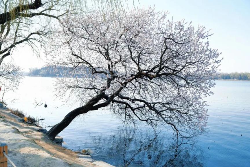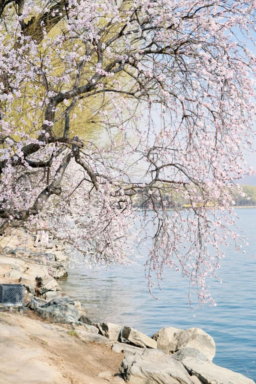 烂漫的粉白与湖水的湛蓝、古建的青灰