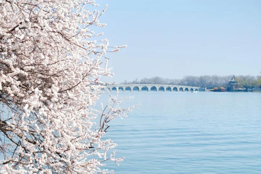 镜桥,这里是公认的“最佳观赏点”之一。桥畔山桃最为繁盛,以桥为前景,以佛香阁为背景,是拍摄颐和园春景的“标准”打卡地。